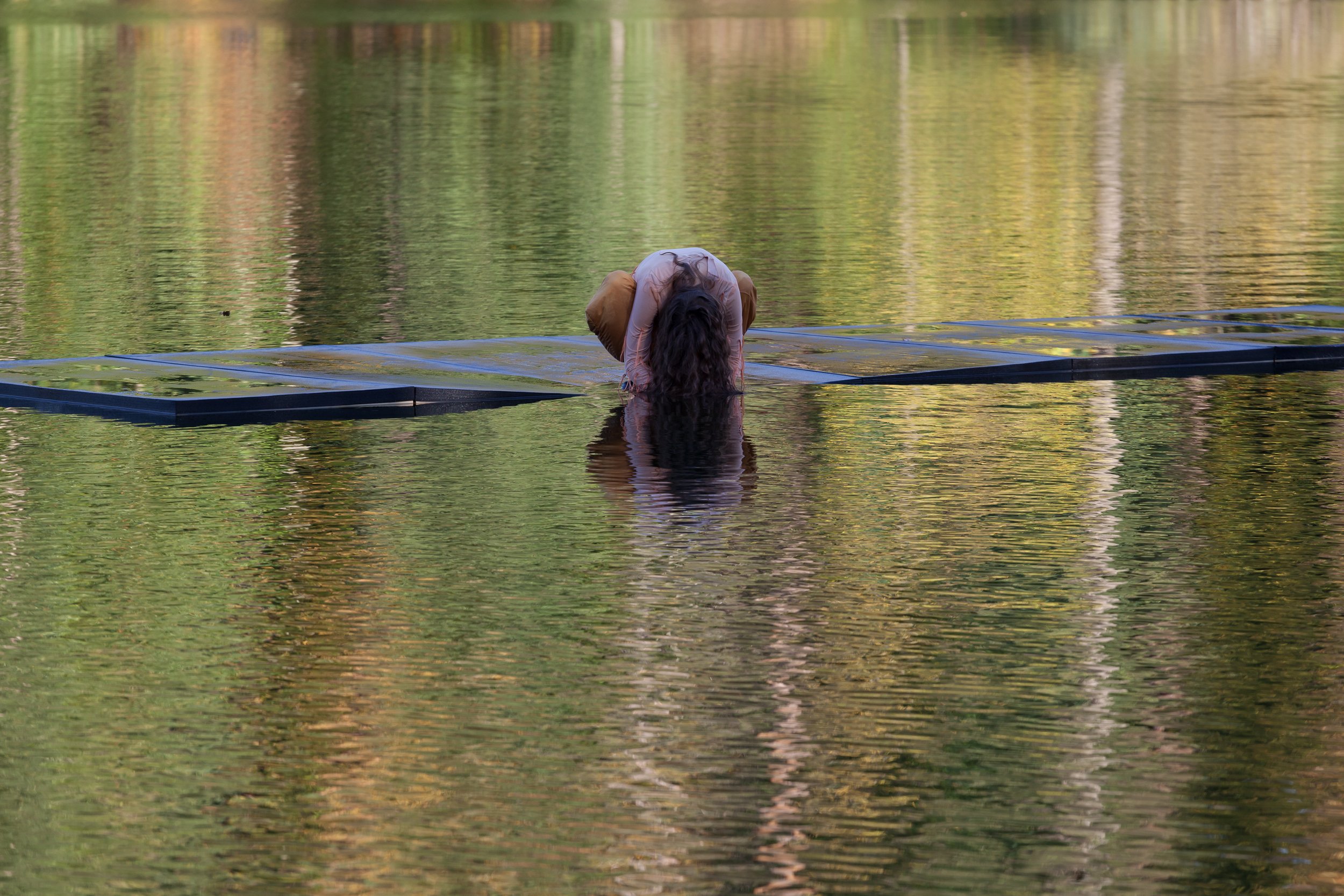 WaterWaltz is a site-specific durational dance installation that takes place on a floating carpet in the middle of a lake. Over the course of an afternoon three dancers are taking turns, performing a solo to the sound of the environment. The audience consists mainly of people passing by, discovering the performance by chance. WaterWaltz's focus is on the fluidity between things - the fluidity of movement sequences, the fluidity between body, dance carpet and water, as well as between people, culture and nature. The work ultimately strives to integrate dance as an art and cultural product into the environment and is designed as an accessible as well as sustainable performance.